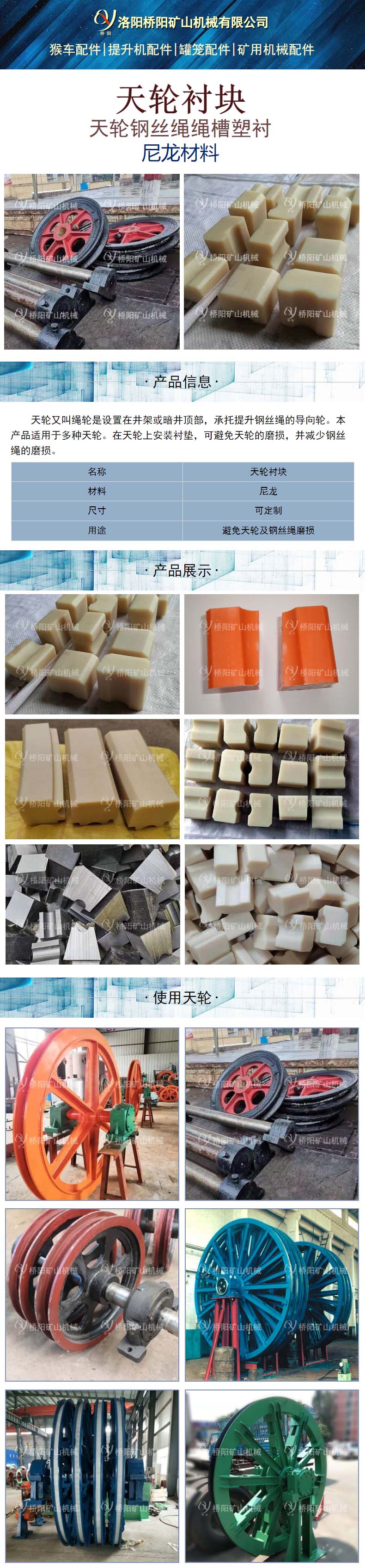 天轮又叫绳轮是设置在井架或暗井顶部,承托提升钢丝绳的导向轮。天轮衬块又称:钢丝绳用导向轮衬块。在天轮上安装衬垫,可避免天轮的磨损,并减少钢丝绳的磨损、延长了钢丝绳的使用周期,从而降低更换天轮和钢丝绳的工作量。