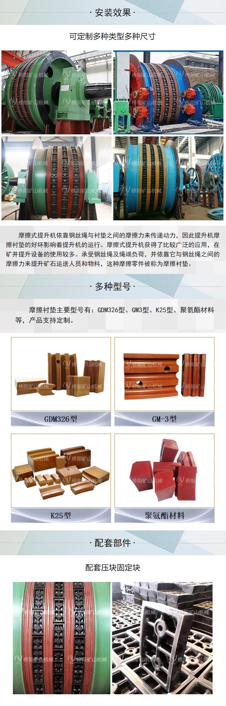 摩擦式提升机依靠摩擦轮上的摩擦零件来承受钢丝绳及绳端负荷,并依靠它与钢丝绳之间的摩擦力来提升矿石运送人员和物料,这种摩擦零件被称为摩擦衬垫。