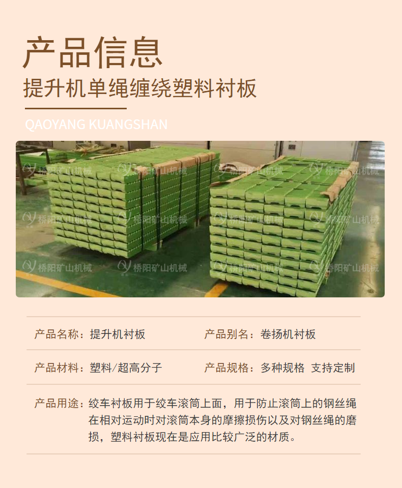 塑料衬板主要应用于煤炭、冶金等矿山用单绳缠绕式提升机主轴装置滚筒、提升绞车主轴装置滚筒,以及类似的、利用滚筒装置缠绕钢丝绳的机械上。
