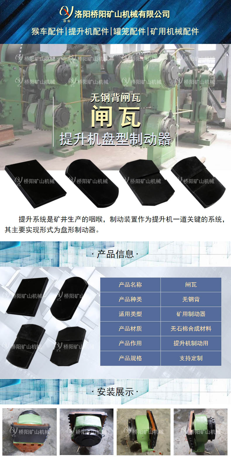 无石棉闸瓦,是一种采用树脂基并用其它增强纤维代替石棉的摩阻材料。闸瓦是矿井提升机制动器的零件之一,如果闸瓦的各种性能达不到设计要求,就会攸关设备能否正常运行。在矿井生产过程中,盘形制动器闸瓦频繁地与制动盘进行摩擦来控制提升机的运行。
