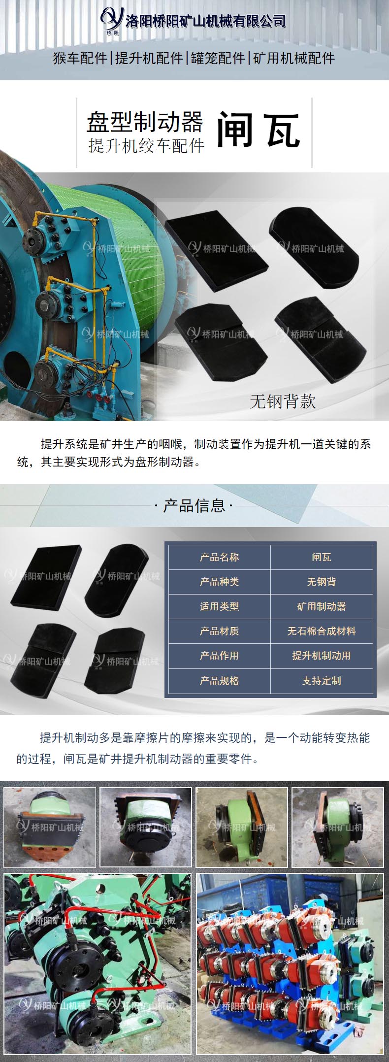 无石棉闸瓦,是一种采用树脂基并用其它增强纤维代替石棉的摩阻材料。闸瓦是矿井提升机制动器的零件之一,如果闸瓦的各种性能达不到设计要求,就会攸关设备能否正常运行。在矿井生产过程中,盘形制动器闸瓦频繁地与制动盘进行摩擦来控制提升机的运行。