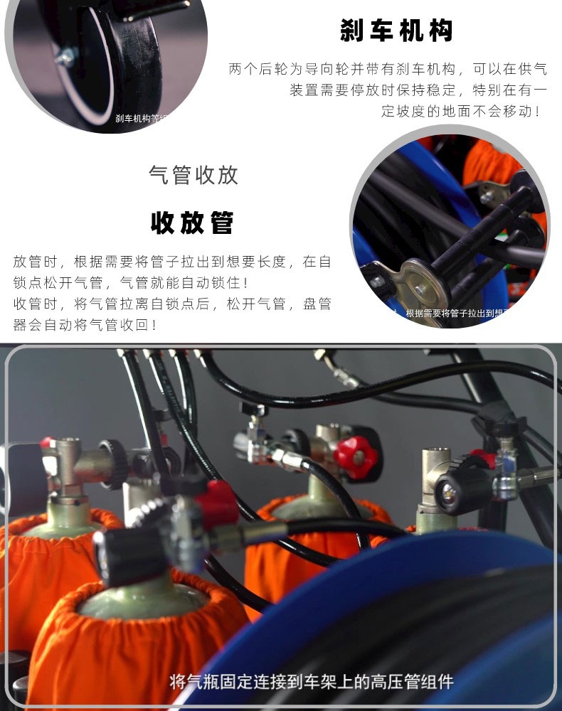 是由:气瓶组件、车架组件、供气管、Y 型三通管、逃生呼吸装置组成。(以 4 瓶式小推车为例),不同零部件间的组合会产生不同的连接方式。