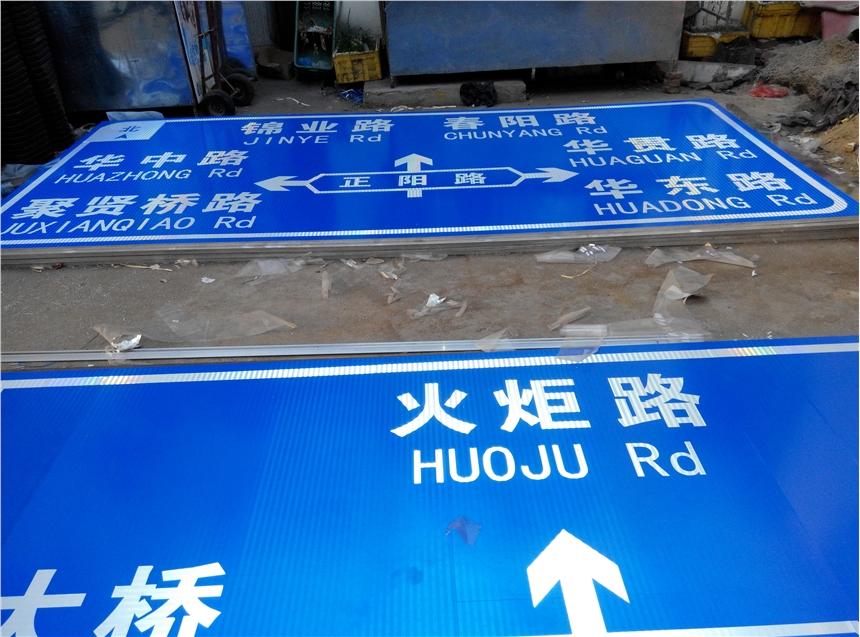 材质特点:1.00-3.00mm铝板厚度,背面安装铝槽(供固定时使用),正面贴反光膜。夜晚反光效果好。