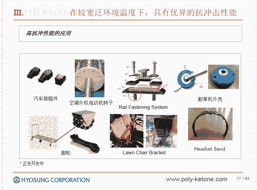 聚酮POKETONE材料:是韩国晓星集团研发生产出的一种综合性能极其优良的工程塑料,属于聚酮类材料。POKETONE是全部主链都由碳素组成的工程塑料,是高结晶性、结实的结晶结构,表现出耐冲击性、耐磨损性、耐化学性、耐燃料性、气体阻隔性能。