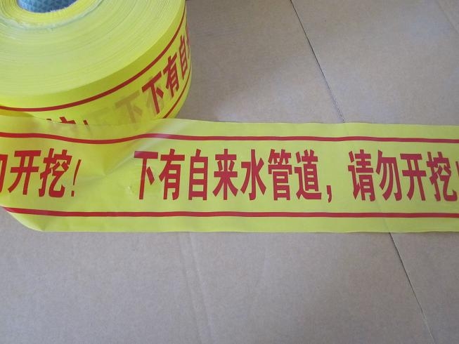地埋式燃气管道警示带 禁止开挖警示带15公分电力电缆警示带,石油管道可探测警示带自来水警示带,燃气警示带,电力地下电缆警示带,光缆警示带,自来水警示管,PE警示带,警示带又称标记带广泛地应用于各种直埋式燃气管道、输油管道、城市给排水等气、液管道输送系统、电力电 缆、通讯光缆等关于国计民生的第五类运输体系及信息传输系统的警示防护,特别对各种情况复杂的城市管网 施工现场、道路施工现场、交通事故现场保护,建筑建设施工现场、田野中的直埋管线有着明显的防护警示作 用,它施工方便,施工与埋管同时进行,埋覆于地下与管线中间,铺设在管道上面30-50CM处,起到警示标志作 用,以免今后开挖施工时管线受无谓损伤,而造成重大事故,避免因意外损坏造成巨大的财产和经济损失,是 各种直埋式管道、线缆安全防护的经济有效、简单易行的用品。 警示带有两种:一种为普通警示带;另一种为夹金属可探测警示带又称示踪带,(带不锈钢金属警示带), 由于随着社会经济不断发展,地下管网建设中越来越多地采用PE、PPR、PVC等塑料管,探测仪器根本无法探测 到管线走向,夹金属警示带可以解决管线无法探测这一难题,且该产品采用高强度、耐老化的高分子材料,以 PE、PP、OPP为主要原料,经防腐处理加工而成,耐腐蚀性能好,色泽鲜艳、醒目,长期铺设在地下50年不腐蚀 ,不褪色,符合长期埋地质量不变要求。 警示带又称标记带广泛地应用于各种直埋式燃气管道、输油管道、城市给排水等气、液管道输送系统、电力电 缆、通讯光缆等关于国计民生的第五类运输体系及信息传输系统的警示防护,特别对各种情况复杂的城市管网 施工现场、道路施工现场、交通事故现场保护,建筑建设施工现场、田野中的直埋管线有着明显的防护警示作 用,它施工方便,施工与埋管同时进行,埋覆于地下与管线中间,铺设在管道上面30-50CM处,起到警示标志作 用,以免今后开挖施工时管线受无谓损伤,而造成重大事故,避免因意外损坏造成巨大的财产和经济损失,是 各种直埋式管道、线缆安全防护的经济有效、简单易行的用品。