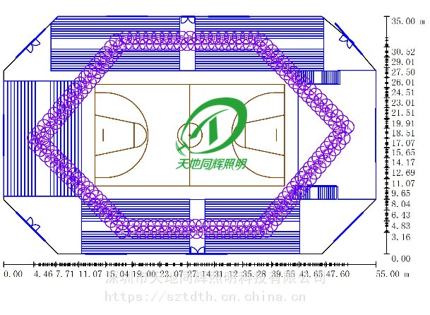 中间部分为比赛场地区域,照度要求较高,采用马道布灯方式,布置于球场两边的上方,朝比赛区域投光