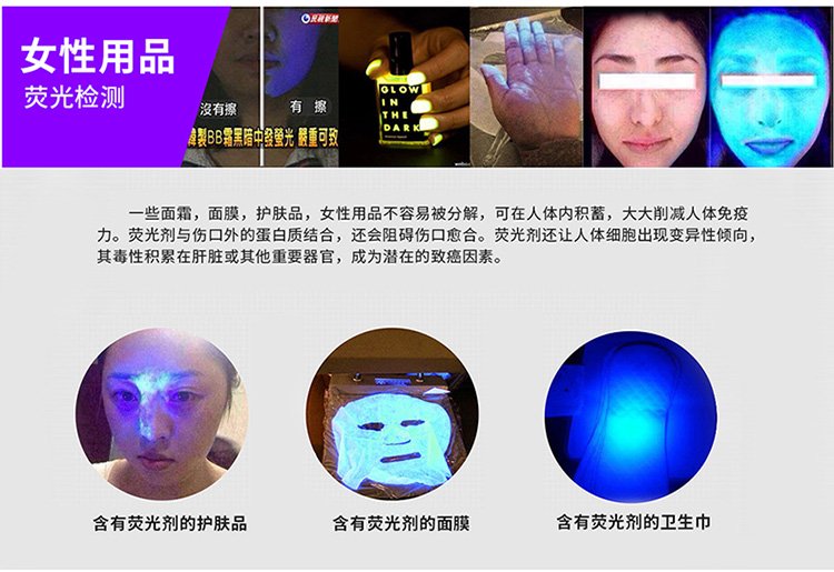 适用环境 | 日常生活照明、各类衣物、日用品荧光检测、宠物尿液检测、防伪检测及特殊物质的荧光检测 | ||