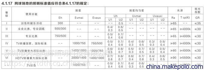 室内网球馆照明标准如下图: