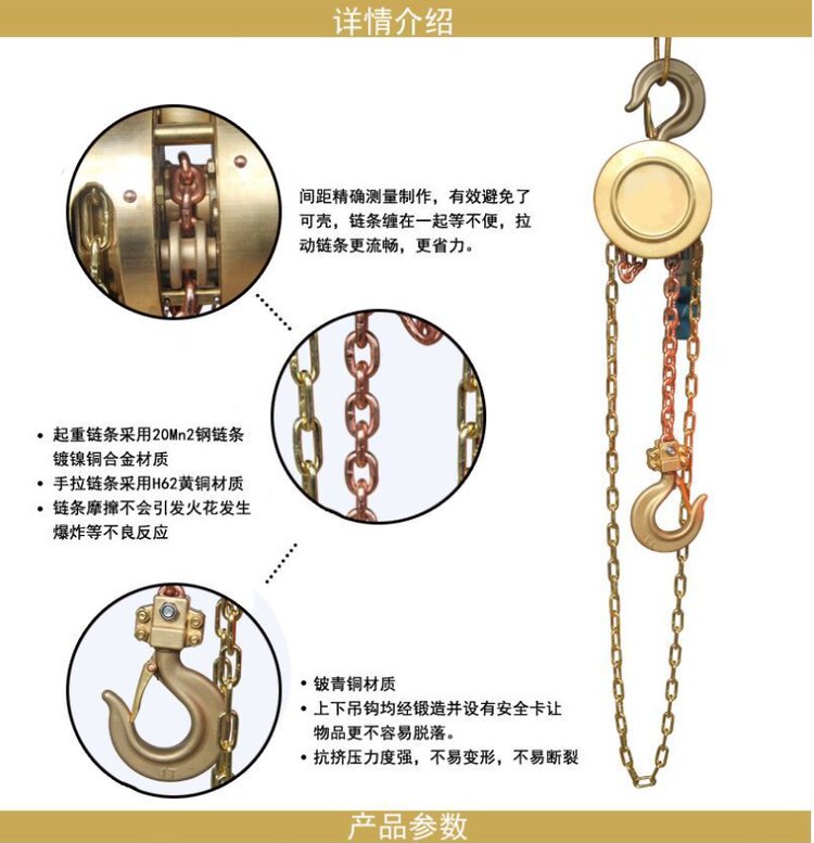 防爆手拉葫芦外壳采用H62铜合金材料,以铝青铜﹑铍青铜作为毛坯,受力,摩擦部位。包括构成防爆手拉葫芦的起重轮﹑手链轮﹑墙板﹑挂钩﹑齿轮﹑齿轮轴采用铝青铜﹑铍青铜合金材料。产品安全可靠,链条摩擦不会引发火花发生爆炸等不良反应。