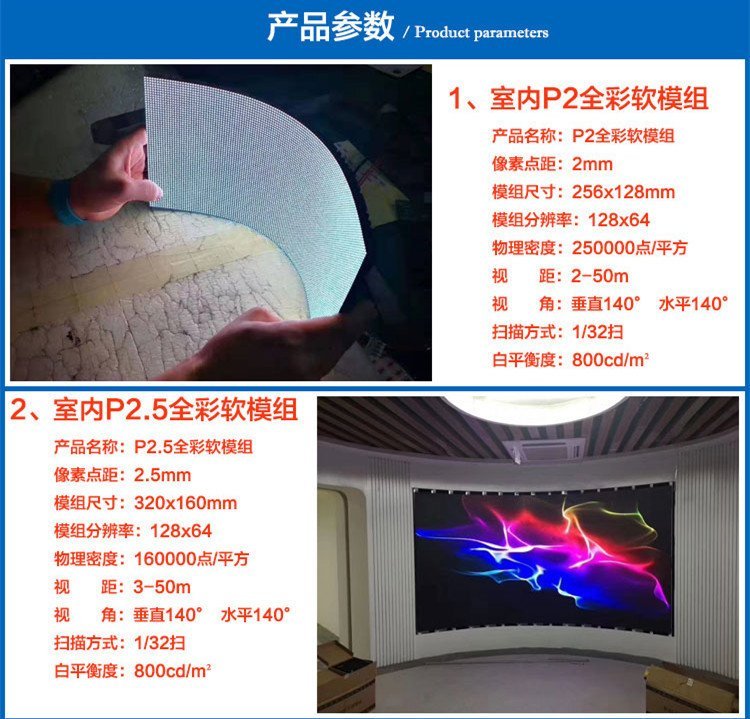 弧形屏LED软模组 柔性LED显示屏软模组 P3LED软模组价格,小间距高清LED显示屏是目前仅剩的具有大力挖掘的LED大屏幕产品,像P1.6 P1.8 P1.9这些以前无人问津的超高端LED彩屏,如今也经常出现在监控室、演播厅、会议厅等场所。柔性弧形屏LED软模组选用工作温度在-40℃~80℃之间的工业级集成电路芯片,防止冬季温度过低使显示屏不能启动。