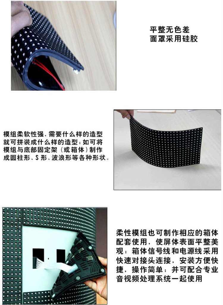 柔性弧形屏LED软模组产品很好地解决了显示屏常见的马赛克现象,具有非常出色的一致性;线路板稳定,线路板采用波峰焊工艺,具有绿油隔氧层,防止了线路的潮湿、氧化,提高了使用寿命;80000小时超长使用寿命(理论寿命值为10年,普通显示屏寿命在4-6万小时),5000小时无故障更美运行,全新产品确保无一个死点,2年以后万分之三以下盲点率,四维鑫光电十年大品牌,超国标96小时老化测试;