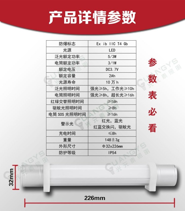 泛光工作时间(强光) | ≥5h | ||