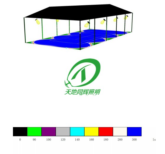 网球是高速移动的小球类运动,需要在很短时间内判断球的运动方向,因此网球需要高的视觉效果,用于室内网球场灯布置应注意不要在基础比赛区上方布置灯具,如果比赛区域上方有球场照明灯,灯光将会给运动员带来严重的眩光。因此,室内网球场一般可在场地两侧较合适位置布置网球场灯,而不能在顶棚垂直投射,且灯具安装高度不应低于9米。根据标准照度要求室内网球场在娱乐模式时为300lx;训练模式为500lx比赛模式为750lx。