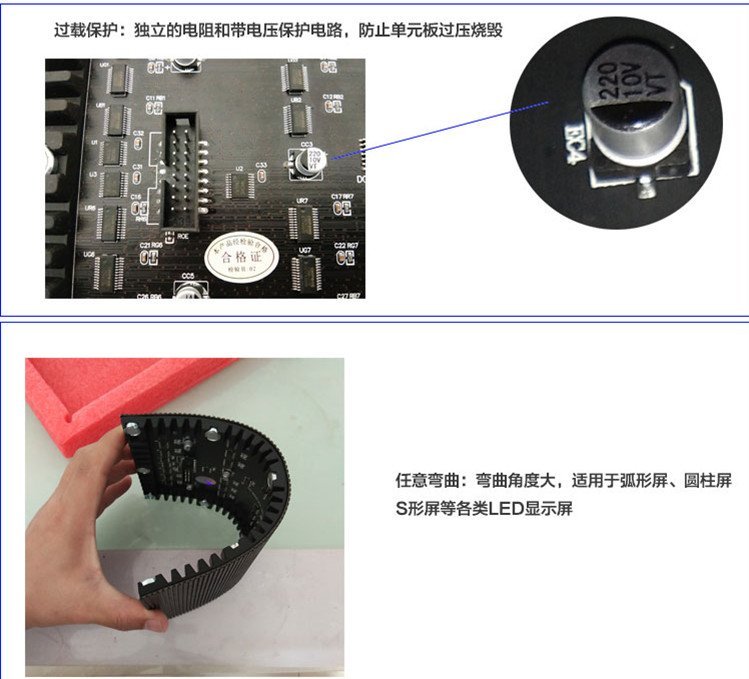 柔性弧形屏LED软模组产品很好地解决了显示屏常见的马赛克现象,具有非常出色的一致性;线路板稳定,线路板采用波峰焊工艺,具有绿油隔氧层,防止了线路的潮湿、氧化,提高了使用寿命;80000小时超长使用寿命(理论寿命值为10年,普通显示屏寿命在4-6万小时),5000小时无故障更美运行,全新产品确保无一个死点,2年以后万分之三以下盲点率,四维鑫光电十年大品牌,超国标96小时老化测试;