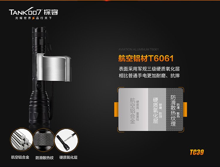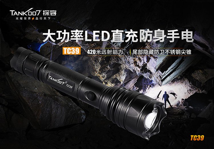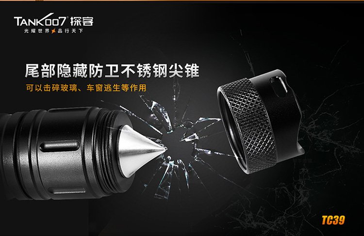 TC39户外直充防身手电筒-带安全锤多功能巡检手电-探客强光手电