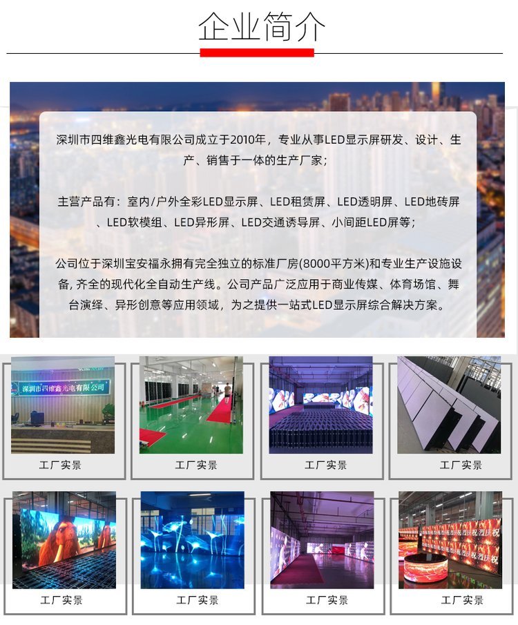 四维鑫光电作为专业的LED显示屏解决方案,能够提供市政工程、广电项目、体育场馆、舞台租赁、LED地砖屏、LED透明屏、LED软模组、商业广告等多种解决方案,为客户提供出众的显示效果。