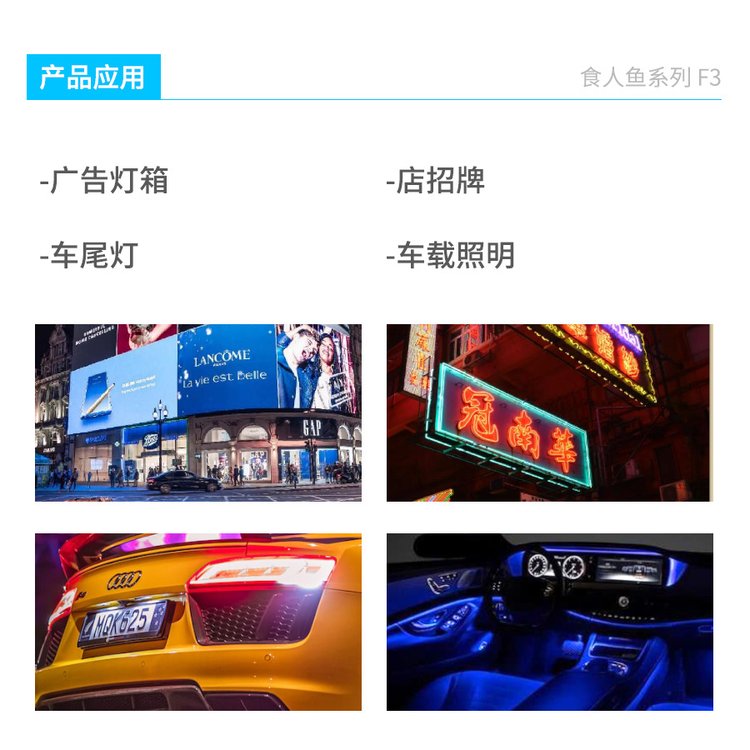 应用领域:广告灯箱、店铺照片、车尾灯、车载照明
