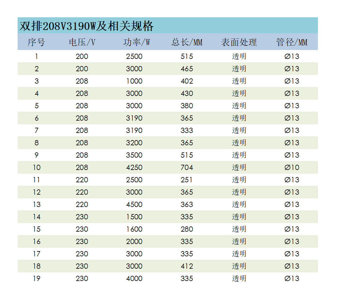 半导体双管石英加热管208V3190W卤素加热管短波透明红外线加热灯
