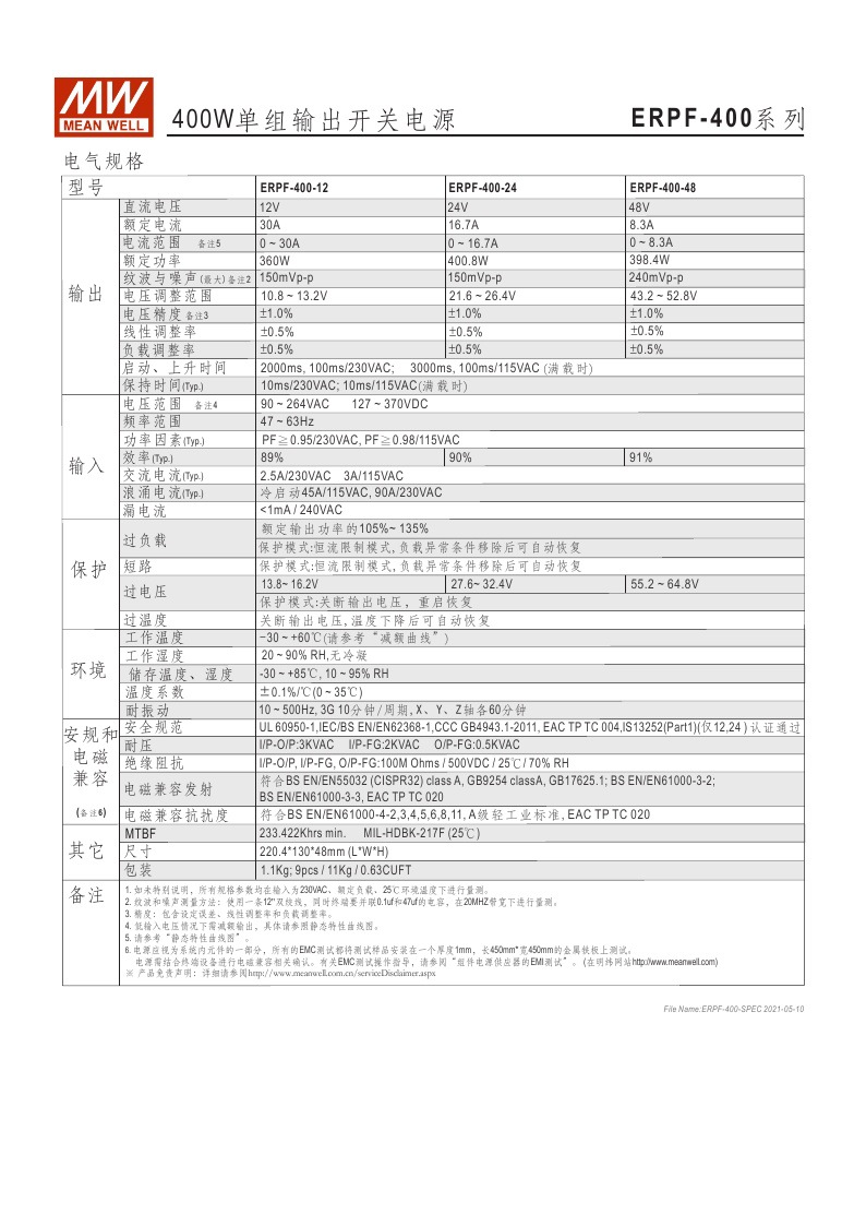 ERPF-400-48 明纬开关电源400W/48V 防雨溅PCB板防水处理 是否进口 | 否 | ||