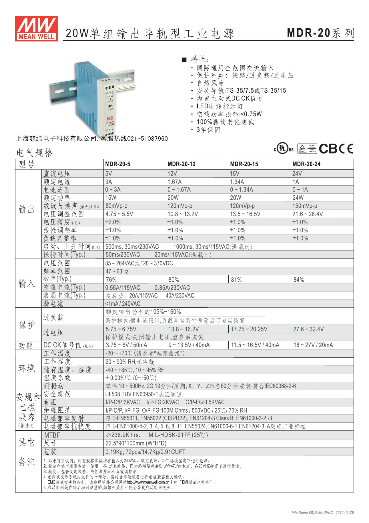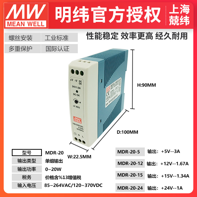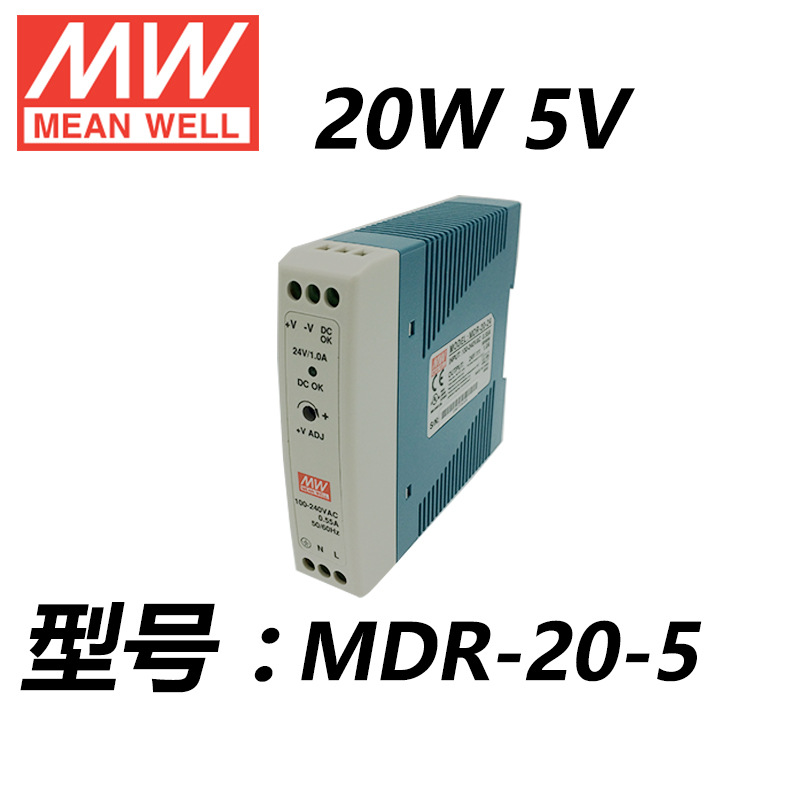 明纬导轨开关电源MDR-20-12可提供20W的单输出免接地低空载损耗