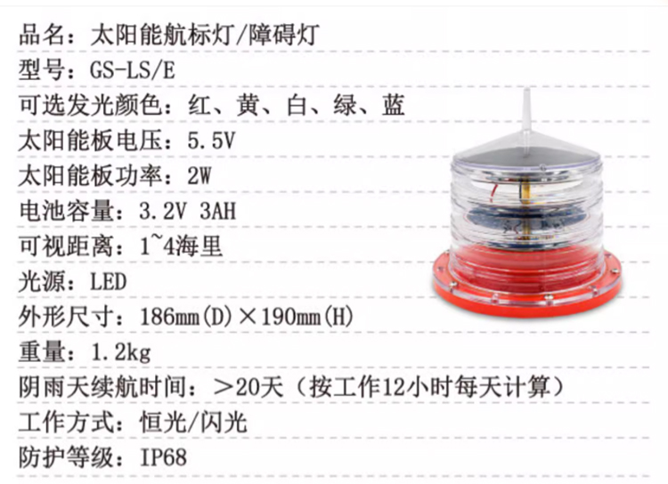 太阳能一体化航标灯 光控感应GS-LS/E船 海上 码头红色闪光GPS障碍灯 型号 | GS-LS-E | ||