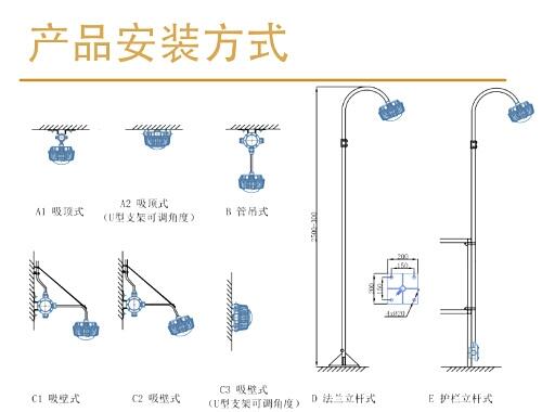 灯具可另配置防爆应急电源装置,当供电网络突发故障正常照明停止后,灯具能在瞬间自动切换到应急照明状态;可采用护栏立杆式和法兰立杆式安装。