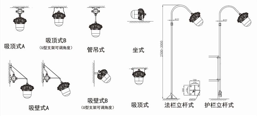 安装方式: A:吸顶式、b:管吊式、C:吸顶式、f:法兰式、护栏式