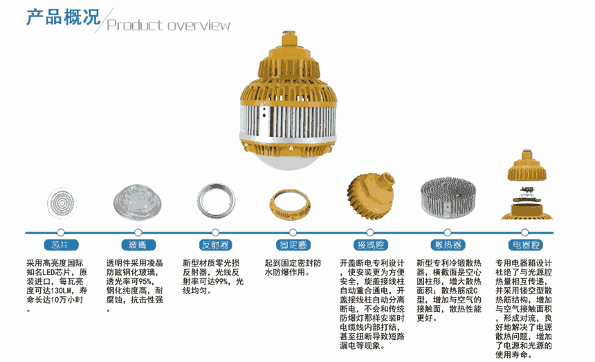 9、特殊的散热结构设计,光源腔、电器腔、接线腔均独立设置,散热性能可靠,保证灯具的长寿命可靠应用;