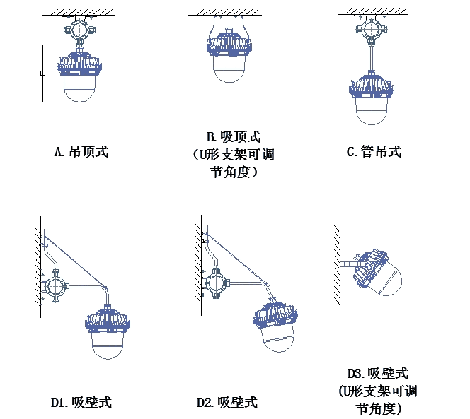 安装方式:A:吸顶式、b:管吊式、C:吸顶式、f:法兰式、护栏式