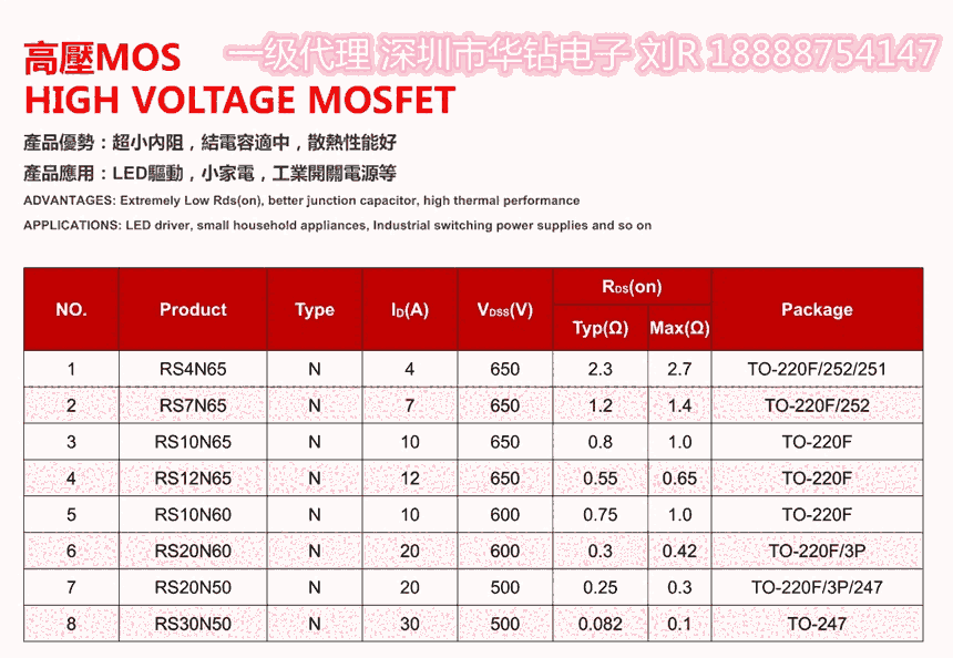 RS4N65D TO-252 4 650 2.1 2.6 LED驱动电源