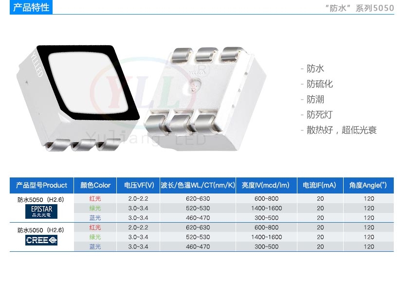 防水系列5050rgb 2.6H LED灯珠特点: