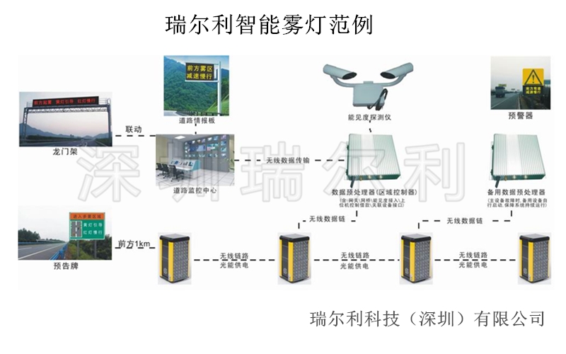 智能雾灯诱导系统,主要解决高速公路弯道、隧道口、桥梁等事故多发地段在雾、雨、雪等恶劣天气条件下的安全问题。在大雾中车辆的速度已经出现了明显的下降,此时车辆与车辆之间的速度差异才是交通事故的直接诱因,差异越大越有可能诱发剐蹭、追尾等事故。例如驾驶员突然遭遇突发情况,完全失去了方向感,本能会急刹车.后边来车反应不及,导致追尾事故发生。