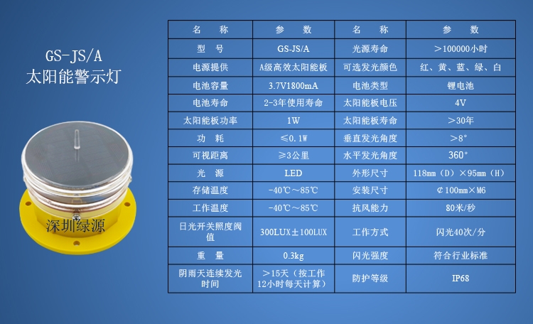 GS-JS-A太阳能警示灯采用内置转换效率高达25%的太阳能电池板一体化设计,配合太阳能专用电池为电源。控制电路采用微功耗单片机控制芯片,能更准确的控制电池充放电状态,同时也降低了控制电路本身能耗。光源采用特殊定制LED芯片,具有发光亮度高,能耗低,寿命长的特点。灯罩采用抗UV的PC材料成型,具有耐腐蚀、抗UV、抗冲击等特点,可选择磁铁安装方式。
