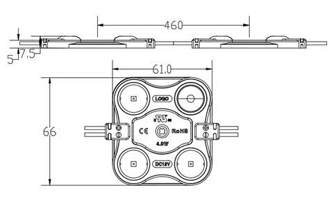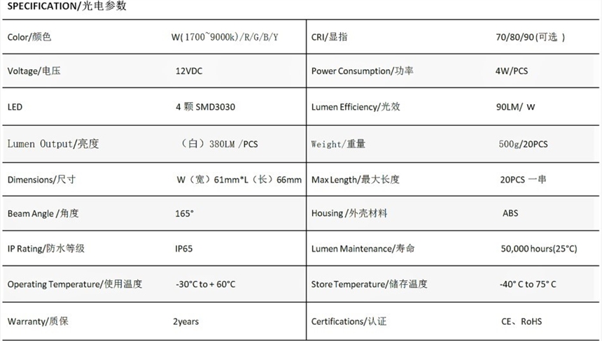 2. 采用连接示意图中方案(单端供电)时:模组标准联级数量20pcs,不可超量串接。用户也可以根据实际需求单个剪断;