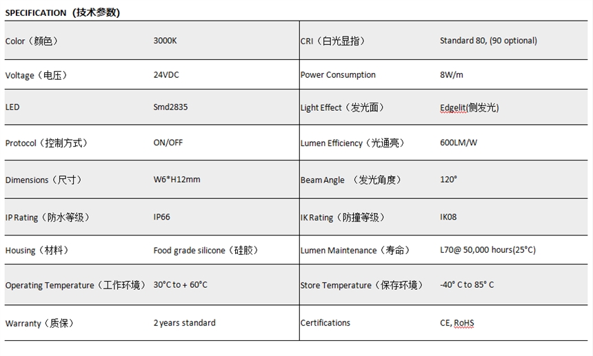 该产品是一个紧凑型侧面弯曲可自然造型的柔线性LED照明解决方案,发光面光色均匀,适用于建筑内外部特殊造型照明应用.此灯带防水等级高达IP66,具有超高的流明输出和极好的光色,最小弯曲半径120mm,同时具备防撞,抗紫外线,耐盐水的特性。