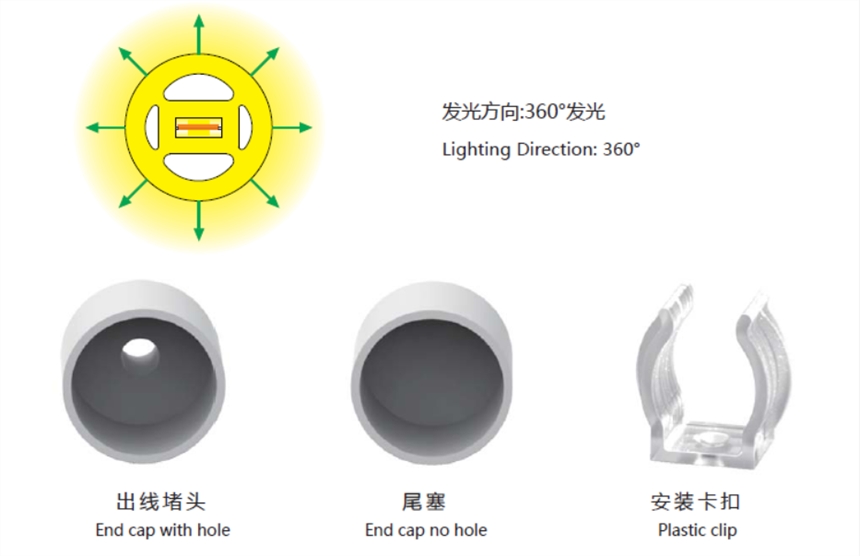 该产品是一款圆形360度发光之硅胶数码霓虹柔性光源,直径2.2公分,光色均匀一致,适用于室内外各种光色造型等