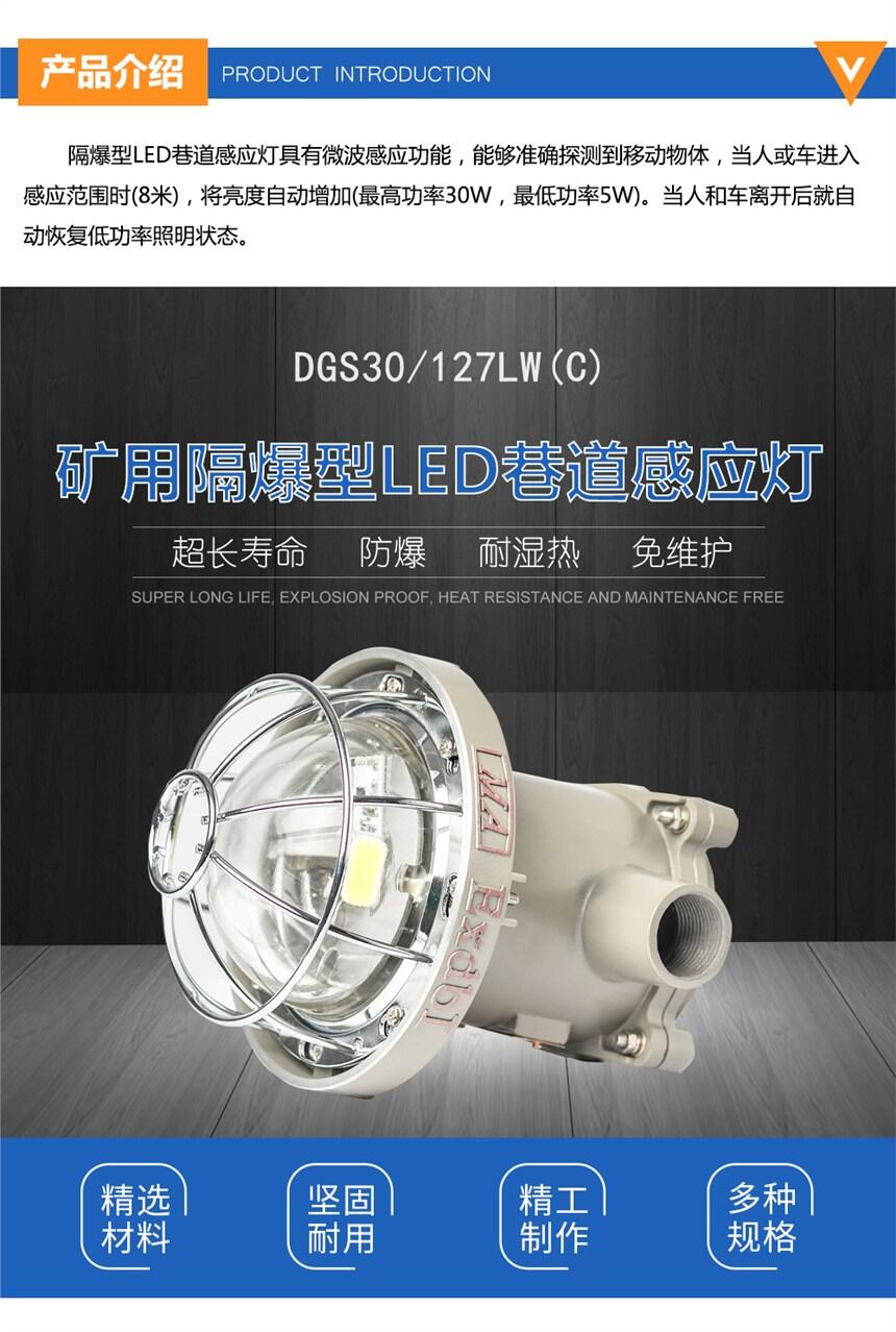5.隔爆型LED巷道感应灯具有微波感应功能,能够准确探测到移动物体,当人或车进入感应范围时(8米),将亮度自动增加(最高功率30W,最低功率5W)。当人和车离开后就自动恢复低功率照明状态。