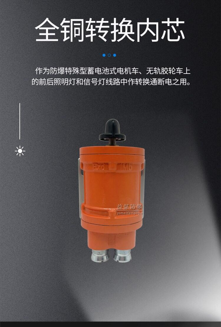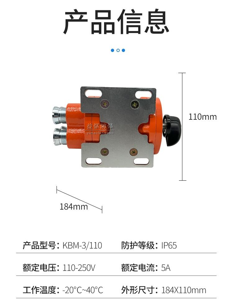 KBM-3/110矿用隔爆型主令开关(以下简称主令开关)是作为防爆特殊型蓄电池式电机车、无轨胶轮车上的前后照明灯和信号灯线路中作转换通断电之用,以实现电机车往返动运行时前有照明灯后有红灯。