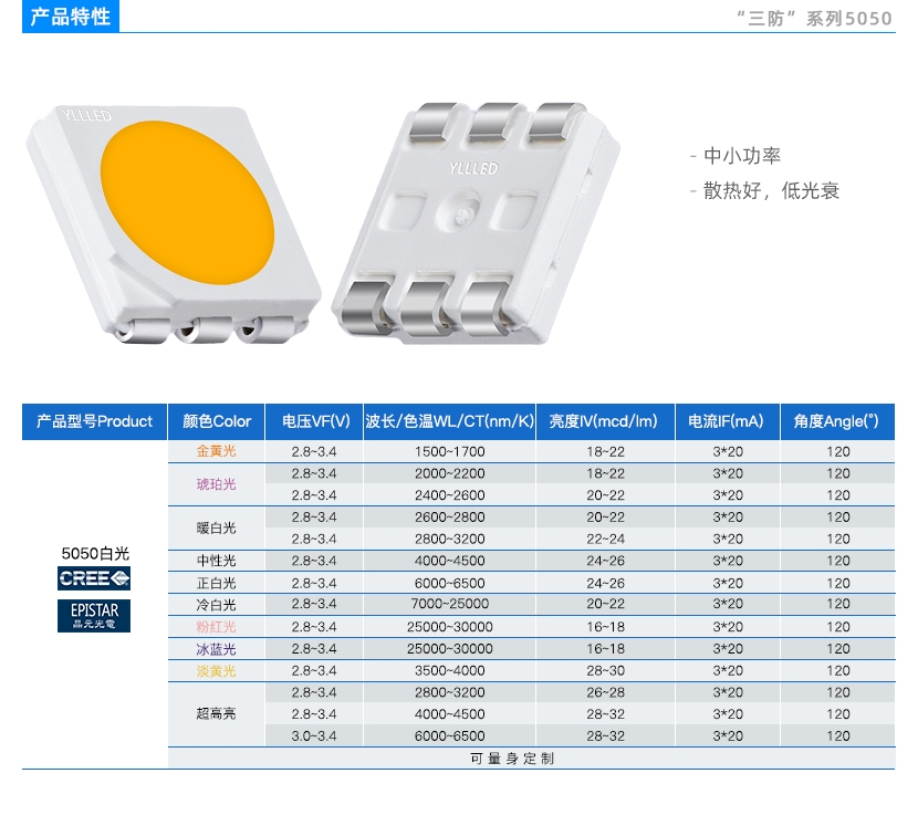 深圳宇亮光电“三防”系列5050暖白光LED贴片规格
