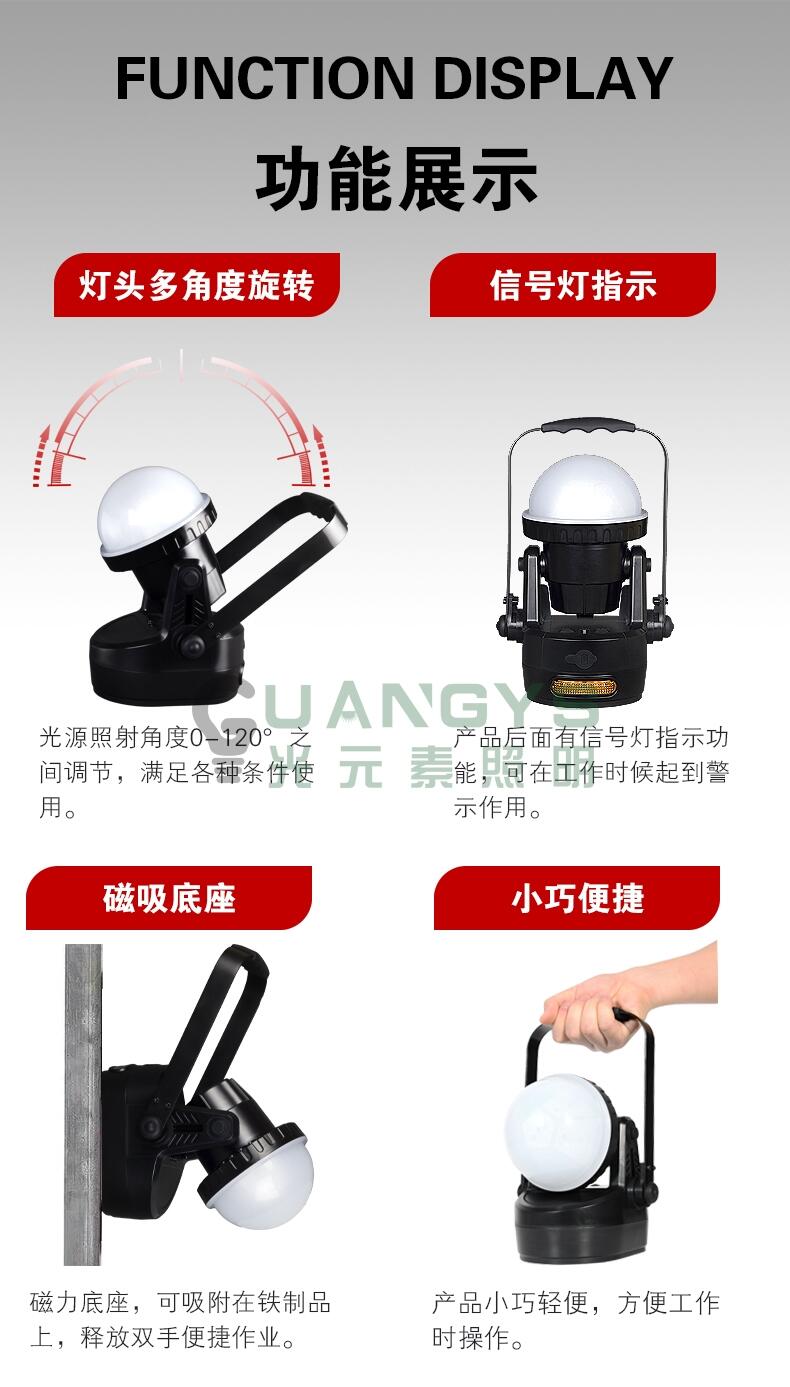 方便耐用:独特的灯头结构设计,照明角度90°~180°可随意调节,全方位照明,重量轻,可手提、座放、吊挂、磁力吸附等,使用方便。