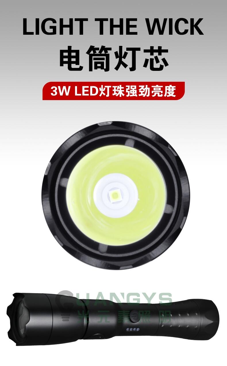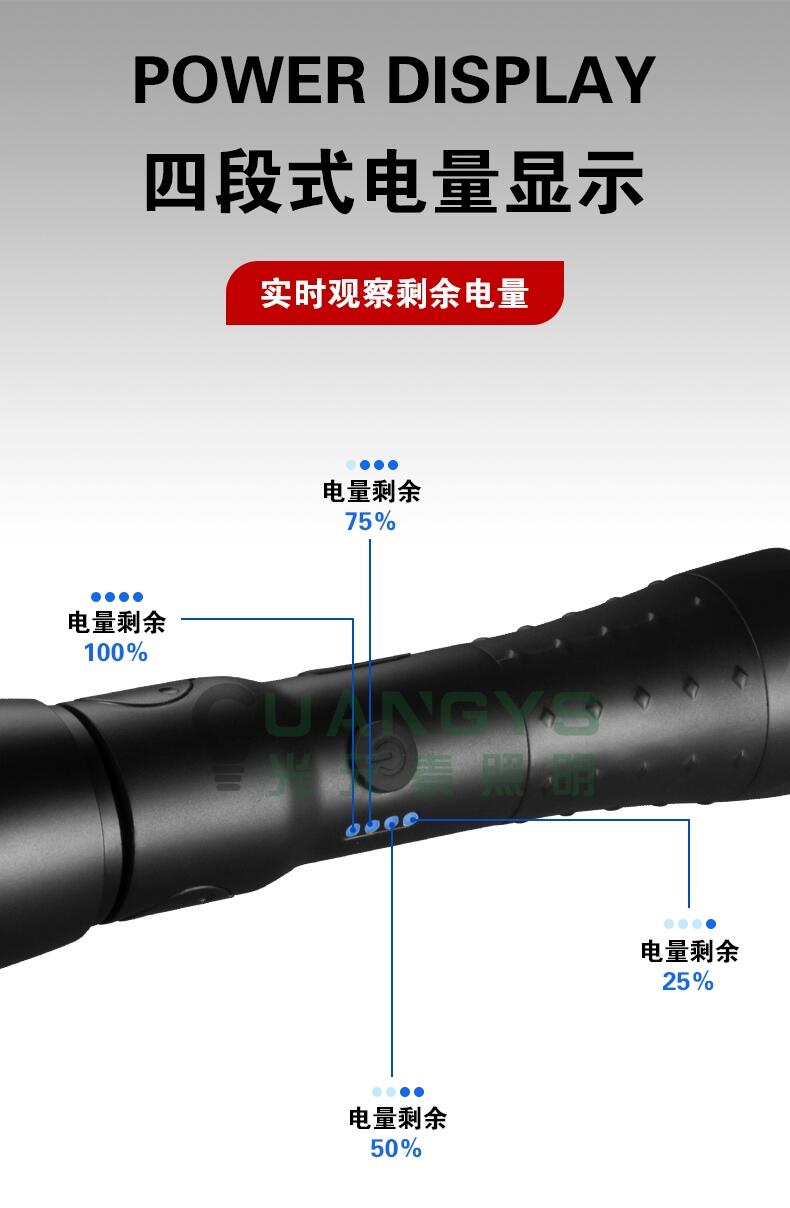 多功能强光防爆电筒外壳采用高硬度铝合金压铸程序,抗强力碰撞和冲击;灯头焦距可调,90°~180°可调节,尾部带磁力吸附,四段式电量显功能示,灯头伸缩结构泛聚光可调,功率3W情况下2600mAh容量电池强光工作时间大于10小时。