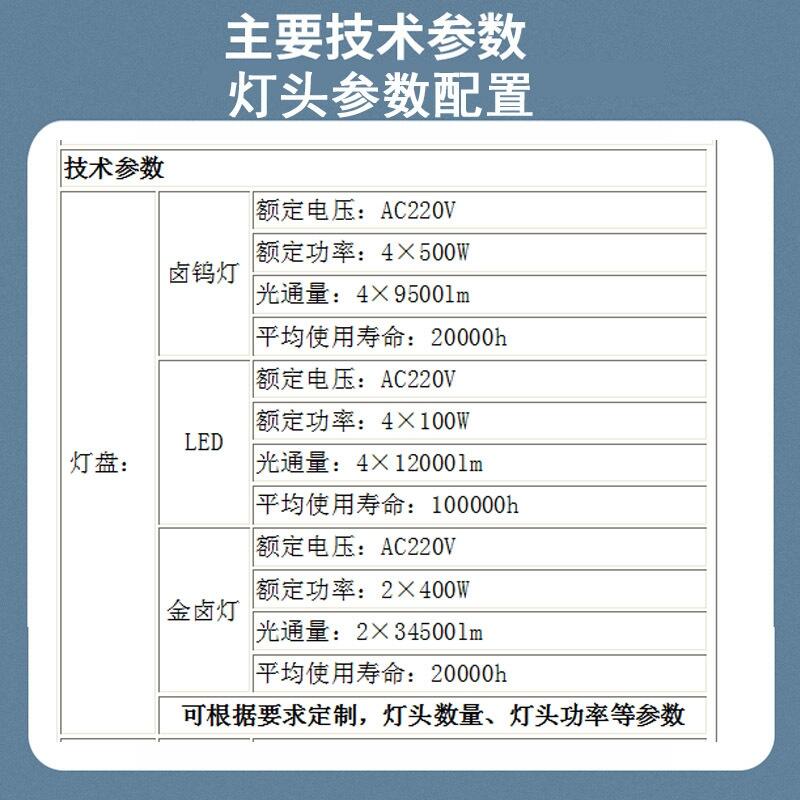 2、额定功率:A型4*500W(卤素灯)/B型2*400W(金卤灯)\C型4*80W(LED灯)\D型4*150W(LED灯)\ E型4*1000W(卤素灯)