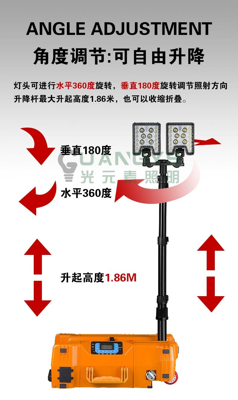 ●灯具采用大容量高能锂电池,照明功率120W,可满足客户施工现场大范围照明需求;