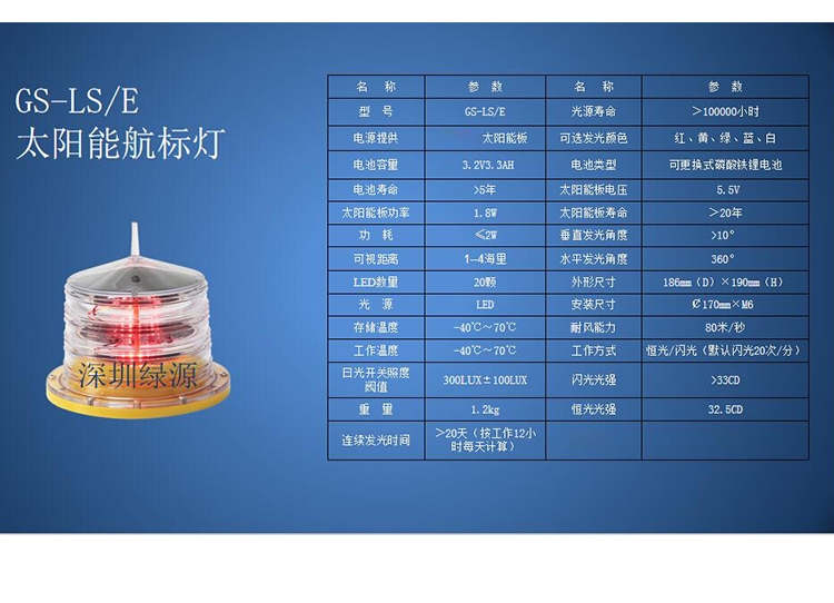 GS-LS-E太阳能航标灯采用内置转换效率高达25%的太阳能电池板一体化设计,配合太阳能专用磷酸铁锂电池为电源。控制电路采用微功耗单片机控制芯片,能更精确的控制电池充放电状态,同时也降低了控制电路本身能耗。光源采用特殊定制LED芯片,具有发光亮度高,能耗低,寿命长的特点。灯罩采用抗UV的PC材料成型,具有耐腐蚀、抗UV、抗冲击等特点。底座采用航海船舶级专用材料,适用于环境恶劣及强腐蚀性环境的海上航道、化工厂等场所。