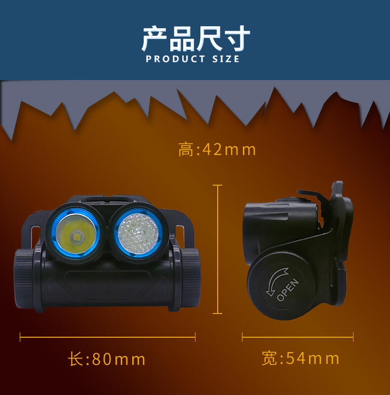 轻便耐用:外形灵巧美观,体积小、重量轻,人性化设计,可直接头戴或安装在头盔上使用,头带柔软、弹性好长短可调,照明角度可随意调节,适合头部佩戴使用。