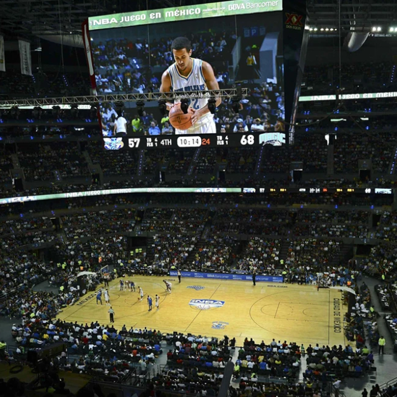 1、中央屏幕:安装在体育馆的中央位置,通常较大尺寸,用于播放比赛实况、重播、赛事统计、广告等内容。