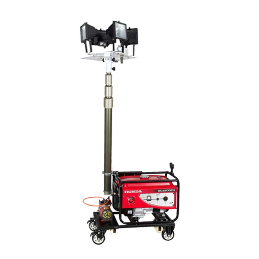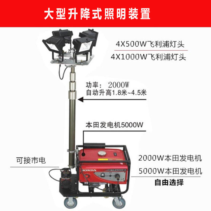 ◆高效节能:采用国际品牌的光源和发电机,光源光效高、显色性高、使用寿命长,发电机可长时间连续工作; ◆照明性能:泛光照明灯盘由4盏500W高效节能灯具组成,聚光照明灯盘由2盏400W金卤灯组成,可根据需要将每个灯头单独做左右或俯仰 调节,旋转实现360°全方位照明;也可将灯头在灯盘上均布向不同方向照明,如需灯头向同一方向照明,则可按所需照明角度 和方位将灯盘整体向开口方向在250°内翻转及以气缸为轴心向左右进行360°旋转;整体照明远近兼顾,亮度高、范围大。 ◆升降性能:选用3节伸缩气缸作为升降调节方式,最大升起高度为4.5米,上下转动灯头可调节光束照射角度,灯光覆盖半径达到45-65米; ◆操作方便:通过无线遥控可在50米范围内分别控制每盏灯的开启和关闭,使用电动或手动气泵可快速控制伸缩气杆的升降; ◆供电形式:可直接使用发电机组供电,也可接通220V市电长时间照明,采用发电机组供电一次注满燃油连续工作时间可达13小时; ◆适用性能:灯盘、气缸和发电机组为整体结构,发电机组底部装有万向轮和铁轨轮,可在坑洼不平的路面及铁轨上运行,整体采用优质 进口金属材料制作,结构紧凑、性能稳定、确保在各种恶劣环境和气候条件下正常工作,防雨淋、喷水、抗风等级为8级。