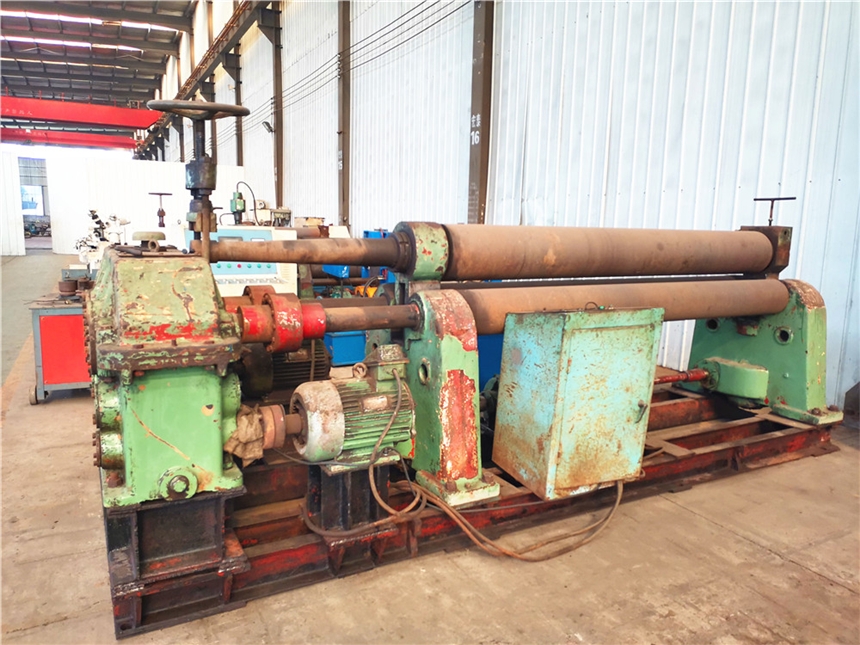 二手卷板机、20x2500对称式三辊卷板机,两下辊为主动固定辊,上辊通过升降丝杆、涡轮、蜗杆在两下辊中间对称作上下移动,两下辊的左、右旋转和上辊的升降移动均靠电机带动减速器来完成,并能借助手动离合器把上辊调节成平行或倾斜位置,以适应卷制圆形和锥形工件的需要,涡轮上下配有特种压力轴承,转动轻松、省电耐用。该机集机身、传动、电器部分为一整体,其结构紧凑、操作方便、便于搬运、安装和维护。