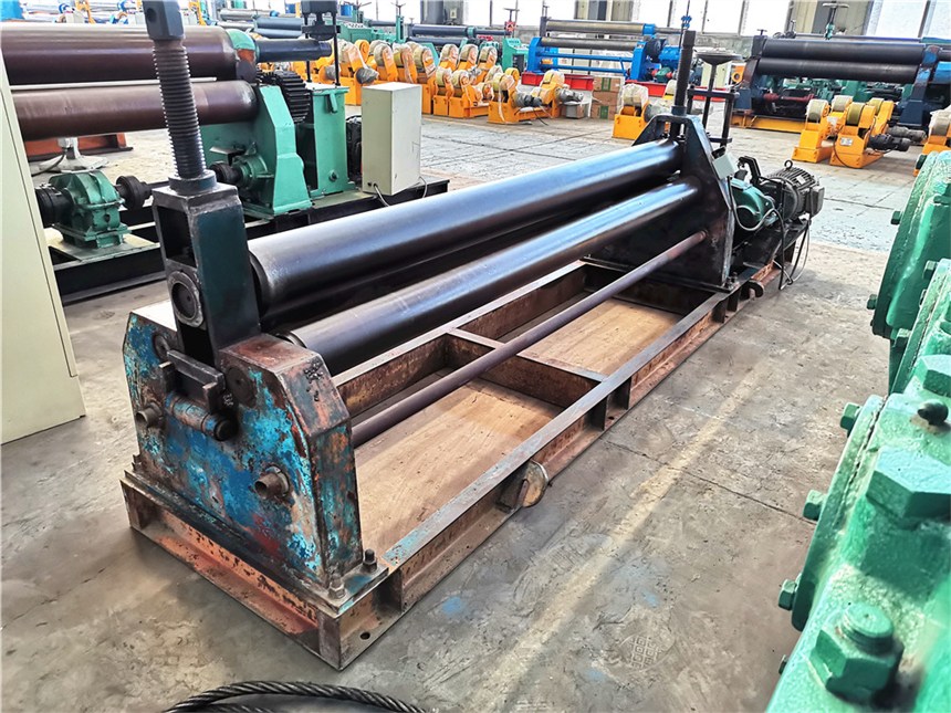 12x2500二手卷板机 半自动三辊卷板机,两下辊为主动固定辊,正、反向旋转运动有主电机带动减速机提供的弯曲扭矩来实现;上辊在两下辊中央对称位置做升降运动,上辊升降运动靠手板手轮带动升降丝杆来实现。该机结构简单,操作方便,适合12毫米以下板材。