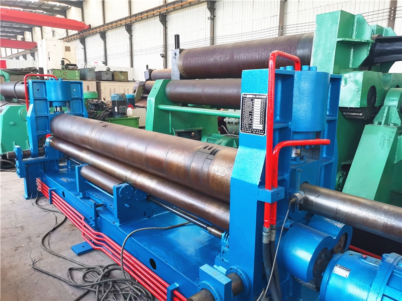 上辊可以垂直移动、水平移动。预弯通过上辊水平移动,使上辊相对于下辊呈非对称位置来实现。滚圆时通过电动机、减速机带动两下辊进行。由于下辊的标高不变,所以便于进料和操作。